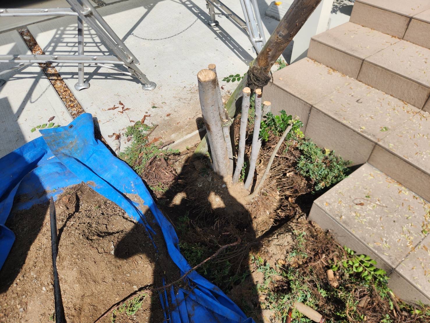 #庭じまい #伐根(木の根を取る) 姫路市北平野模様 シマトネリコと花壇撤去して、スッキリ、駐車場スペースに